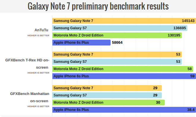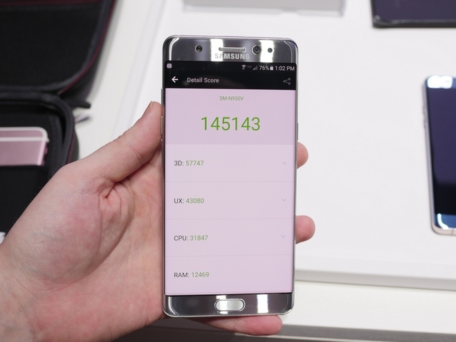 در اکثر بخشها، عملکرد نوت 7 بسیار شبیه به نتایج پرچمدار سری اس سامسونگ است. جای تعجبی ندارد چون هم در نوت 7 و هم گلکسی اس7 شاهد چیپ اسنپدراگون 820 شرکت کوالکام و 4 گیگابایت حافظهی رم هستیم. در تستهای GFXBench T-Rex و GFXBench Manhattan، امتیاز نوت 7 دقیقا برابر با امتیاز گلکسی اس7 شده است اما در تست آنتوتو، گوشی جدید با امتیاز حدود 145000، توانسته 9000 امتیاز از اس7 فراتر رود. نتیجهی طبیعی این اتفاق پیش افتادن نوت 7 از دو رقیب قدرتمند دیگر یعنی موتو زِد دروید و آیفون 6اس پلاس نیز هست.