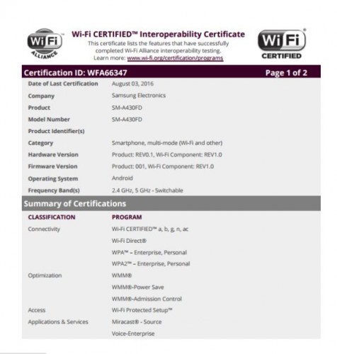 اطلاعات این گوشی جدید طی کسب گواهینامه Wi-Fi آن در موسسه Wi-Fi Alliance لو رفته است و مدل آن SM-430 خواهد بود. حتماً این مورد را میدانید که گوشی Galaxy A3 2016 با نام مدل SM-A310 شناخته میشود و گوشی Galaxy A5 2016 هم با مدل SM-A510. سال گذشته هم این دو گوشی با دو مدل A300 و A500 روانه بازار شدند. پس الگوی کار مشخص است، گوشی Galaxy A4 که با مدل SM-A430 روانه بازار خواهد شد در واقع مدل 2017 خواهد بود.