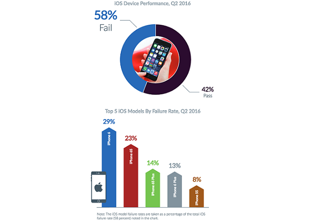 براساس نتایج این تحقیقات سیستم عامل iOS دارای میزان نقص و خرابی 58 درصد است. این در حالی است که این رقم برای گوشیهای اندرویدی 35 درصد عنوان شده است. در طی بررسی های انجام شده، این اولین باری است که گوشیهای آیفون عملکرد ضعیفتری نسبت به گوشیهای اندرویدی از خود نشان داده اند. میزان نقص و شکست سیستم عامل اندروید در سه ماهه اول از سال 2016 در حدود 44 درصد گزارش شده بود اما به نظر میرسد با بهروز رسانیهای صورت گرفته این میزان کاهش مناسبی پیدا کرده است.