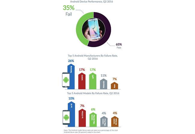 این تحقیقات همچنین نشان میدهد که که در بین محصولات iOS، گوشی آیفون 6 با 29 درصد، دارای بیشترین میزان نقص سیستم عامل است و پس از آن نیز گوشیهای آیفون 6 اس و 6 اس پلاس دارای بالاترین رتبهها هستند. در بین محصولات اندرویدی نیز به ترتیب محصولات سامسونگ، لنوو و LeTV ضعیفترین عملکرد را از خود نشان دادهاند. در این تحقیقات میزان نقص محصولات سامسونگ 26 درصد گزارش شده است. این در حالی است که محصولات موتورلا تنها به میزان 11 درصد دچار مشکل هستند.