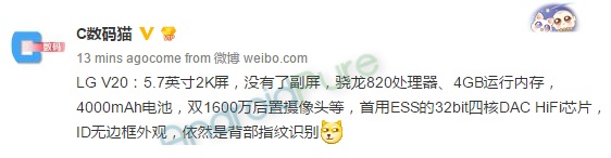 طبق آنچه در مورد بیشتر گوشی های معروف دوران ما اتفاق میافتد، اطلاعات گوشی های هوشمند قبل از معرفی شان در شبکه اجتماعی چینی Weibo معرفی میشوند و مشخصات آنها به صورت غیر رسمی اعلام میشود. در مورد V20 هم این اتفاق افتاده است و یکی از کاربران شبکه میکروبلاگینگ Weibo این اطلاعات را منتشر کرده است.