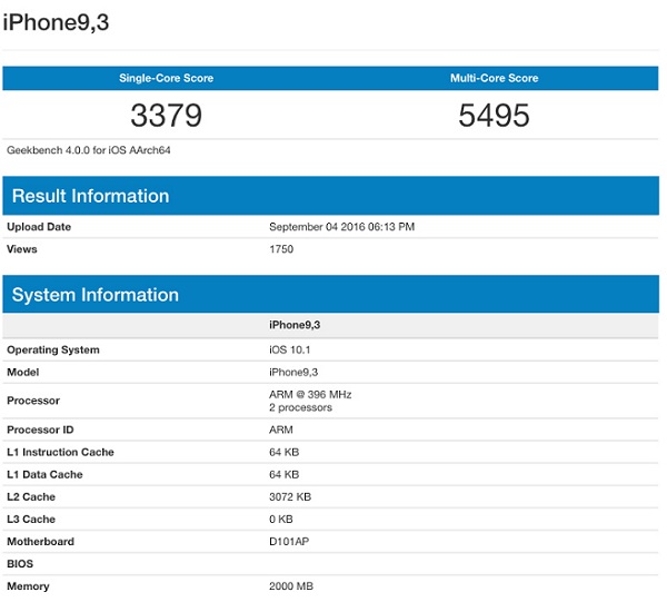 تصویر نشان داده شده، تست را در تاریخ 4 سپتامبر (14 شهریور) و روی دستگاهی با نام iPhone9,3 نشان میدهد که انتظار میرود همان آیفون 7 با سایز 4.7 اینچ و 2 گیگابایت حافظهی رم باشد. این گوشی روی iOS 10.1 اجرا شده و از یک پردازندهی دوهستهای بهره میبرد.