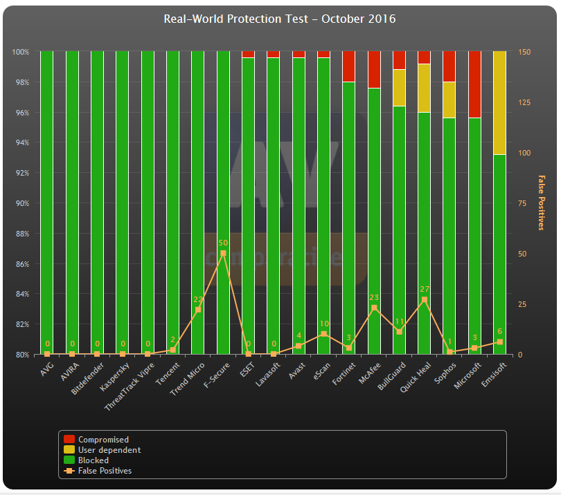 نمودار فوق بهترین آنتی ویروس های ماه اکتبر (بروزرسانی: 10 نوامبر) را نشان می دهد. هر یک از آنتی ویروس های Bitdefender ،AVIRA ،AVG،اKaspersky و ThreatTrack Vipre (به ترتیب الفبا)، موفق به تشخیص و مسدود کردن 100 درصد تهدیدها بدون تشخیص اشتباه(False Positive) شده اند. همچنین Trend Micro ،Tencent و F-Secure نیز قادر به شناسایی 100 درصد بدافزارها بوده اند اما به ترتیب 2، 22 و 50 تشخیص اشتباه نیز داشته اند.