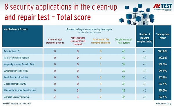 انستیتو امنیتی AV-TEST اخیراً محصولات امنیتی رایج و محبوب را از نظر توانایی پاکسازی بدافزارها و ترمیم اثرات سوء بدافزارها بررسی کرده به انتخاب هرچه بهتر یک محصول امنیتی کارآمد به کاربران می کند. جدول فوق نتیجه بررسی طولانی مدت در طول شش ماهه نخست سال 2016 را نشان می دهد. البته این بررسی تا پایان سال میلادی جاری و به مدت در مجموع 6 ماه دیگر ادامه می یابد. این بررسی بر روی ویندوز 7 انجام شده است.