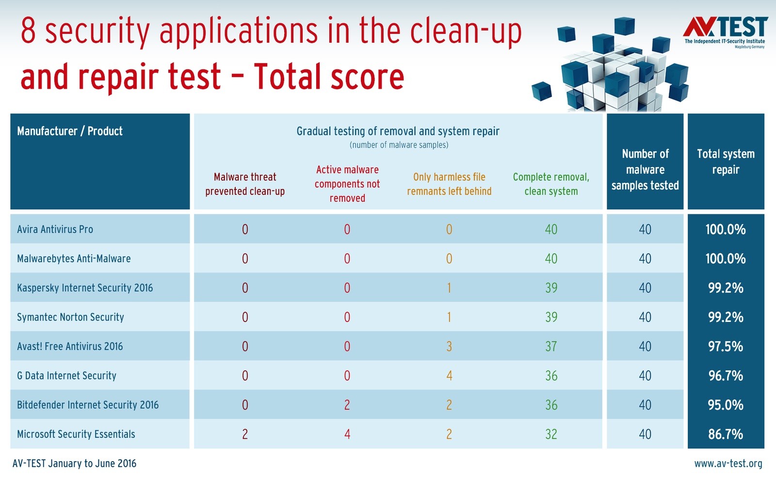 نتیجه فاز نخست این بررسی که شش ماه به طول انجامیده نشان می دهد آنتی ویروس Avira Antivirus Pro و Malwarebytes Anti-Malwareقادر به پاکسازی کامل 100 درصد بدافزارهای مقیم سیستم بوده اند. Kaspersky Internet Security 2016 و Symantec’s Norton Security با 99.2 درصد (پاکسازی کامل 39 بدافزار از مجموع 40 بدافزار) در جایگاه بعدی قرار گرفته اند.