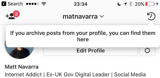 با فعالشدن این قابلیت، یک آیکون ساعت در بالای صفحه پروفایل شما نشان داده خواهد شد و پستهای آرشیو شده در این بخش نگهداری میشود. آرشیو پستها نیز با انتخاب پست مدنظرتان و انتخاب گزینه Archive امکانپذیر خواهد بود و برای بازگرداندن پستهای آرشیو شده نیز باید از آیکون ساعت به منظور دسترسی به آنها کمک بگیرید.