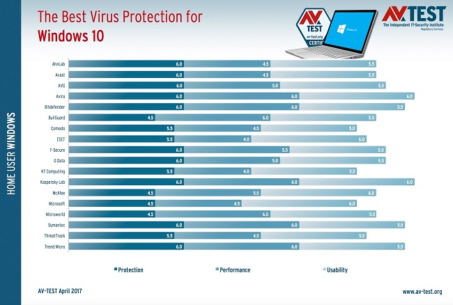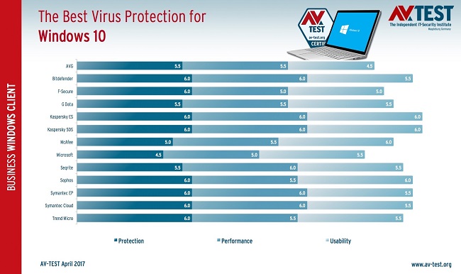 اطلاعات منتشر شده از سوی موسسه AV-TEST نشان میدهد که این دو نرم افزار توانسته اند در بخشهای محافظت، عملکرد و قابل استفاده بودن، نمره 6 از 6 را کسب کنند و این بررسی را با کسب 18 امتیاز پشت سر بگذارند. در این بررسی Trend Micro، Symantec و Bitdefender نیز توانسته اند جایگاههای بعدی را کسب کنند.