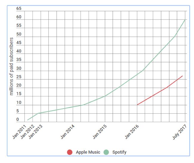 تمرکز کامل اسپاتیفای روی سرویس پخش موسیقی باعث شده این شرکت بتواند تعداد کاربران خود را به مراتب سریعتر از آنچه در قالب راهکار ارائه شده توسط اپل شاهد هستیم افزایش دهد. به عنوان مثال، اسپاتیفای موفق شده ۲۰ میلیون کاربر پولی را در کمتر از یک سال برای سرویس خود جذب کند حال آنکه اپل برای دست یافتن به پیشرفت مشابه، به یک سال و نیم زمان نیاز داشته است. به این ترتیب، تعداد ثبتنام کنندگان سرویس اسپاتیفای حالا به ۶۰ میلیون رسیده است که در مقایسه با ۲۷ میلیون کاربر اپل موزیک قرار میگیرد. تعداد کاربران اسپاتیفای در مقایسه با آنچه در ماه مارس اعلام شده بود (رقم ۵۰ میلیون کاربر) از افزایش ده میلیونی حکایت دارد.