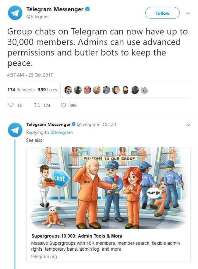 توسعه دهنده پیام رسان تلگرام تصمیم گرفته تعداد افراد مجاز در سوپرگروه ها را به ۳۰ هزارنفر افزایش دهد. بر اساس توییتی که در حساب کاربری تلگرام منتشر شده، سیاستها به نحوی است تا سوپرگروهها و گروههای معمولی تا حد زیادی به هم شبیه شوند تا به تدریج، گروههای معمولی حذف شده و تنها گزینهای که برای ایجاد، در مقابل کاربران باقی خواهد ماند، سوپرگروهها باشند. در بیانیه تلگرام اینچنین میخوانیم: