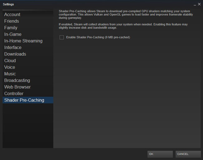 در آخرین نسخه از بروزرسانی نرمافزار Steam قابلیتی جدید به نام Shader Pre-Caching اضافه شده است که کارایی آن برای گیمرهاییست که حتی کمترین تعداد فریم را نمیخواهند از دست دهند. البته در ازای این قابلیت مقدار مصرف ترافیک اینترنت افزایش خواهد یافت.