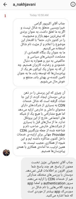 "ما رسالت خود را، برقراری ارتباط مشتریان با آنچه برایشان مهم است، میدانیم و صرفنظر از مصلحتاندیشیهای سیاسی و حاکمیتی، خشنودی و رضایت کاربران، مهمترین هدف ماست. به عنوان یک اپراتور، رعایت بیطرفی، اصل فعالیت ماست و حامی فعالیت توسعه کاربری همه پیامرسانها هستیم. این شرکت خدمات CDN به بسیاری از شرکتهای دارای محتوای داخلی و خارجی ارائه میدهد ولیکن هیچ مشارکتی با هیچ یک از شبکههای اجتماعی خارج از این پروتکل وجود ندارد؛ چنانچه اگر شرکتهای فعال در این حوره نیز بخواهند میتوانند از این خدمات استفاده کنند؛ در همین حال، ما از هرگونه همکاری با سرویسهای داخلی و خارجی که بتواند امکانات پیش روی مشتریان و رضایت آنان را توسعه دهد، استقبال میکنیم."