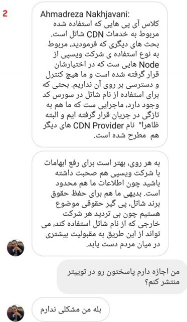 این فعال رسانهای، تصویر مکالمهاش با مدیر شاتل را به شرح زیر در توییترش منتشر کرده است که در گوشهای از آن گفته شده شاتل از نظر حقوقی پیگیر این اتفاق میشود: