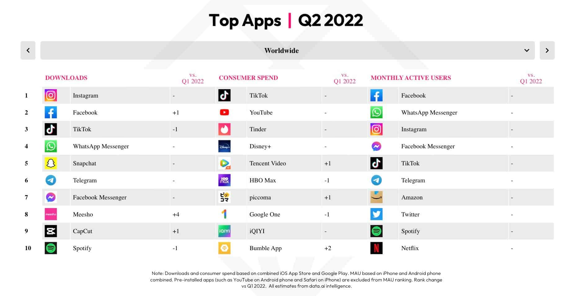 در عین حال، data.ai رتبهبندی محبوبترین بازیها و اپلیکیشنها در سه ماهه دوم را نیز منتشر کرده است. از نظر تعداد دانلود در سراسر جهان، نرمافزار اینستاگرام و از نظر مدت زمان صرف شده،TikTok پیشتاز است. در میان برنامههای غیربازی هم فیسبوک همچنان در صدر تعداد کاربر فعال ماهانه بوده و بالاتر از WhatsApp، Instagram، Messenger، TikTok، Telegramو غیره است.