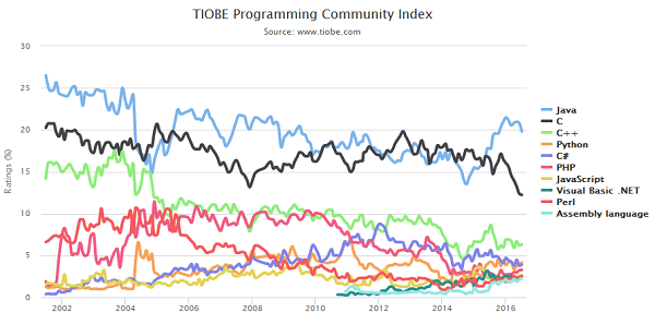 در رده بندی فعلی TIOBE که به عنوان index شناخته می شود، اسمبلی در جایگاه شماره 10 زبان های برنامه نویسی دنیا قرار دارد. Java و C به ترتیب جایگاه اول و دوم این لیست را به خود اختصاص داده اند. جالب تر اینکه پس از یک دهه، Java و C جایگاه خود را به یکدیگر واگذار کرده اند. این ماه Java زبان برنامه نویسی شماره یک دنیا است.