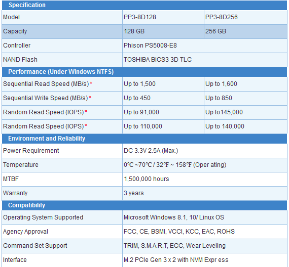 سرعت خواندن و نوشتن متوالی در مدل 128 گیگابایتی به ترتیب به 1500 و 450 مگابایت در ثانیه و در مدل 256 گیگابایتی به 1600 و 850 مگابایت در ثانیه میرسد. عملکرد خواندن و نوشتن تصادفی 4K در مدل 128 گیگابایتی به ترتیب به 91,000IOPS و 110,000IOPS و در مدل 256 گیگابایتی به 145,000IOPS و 140,000IOPS میرسد.