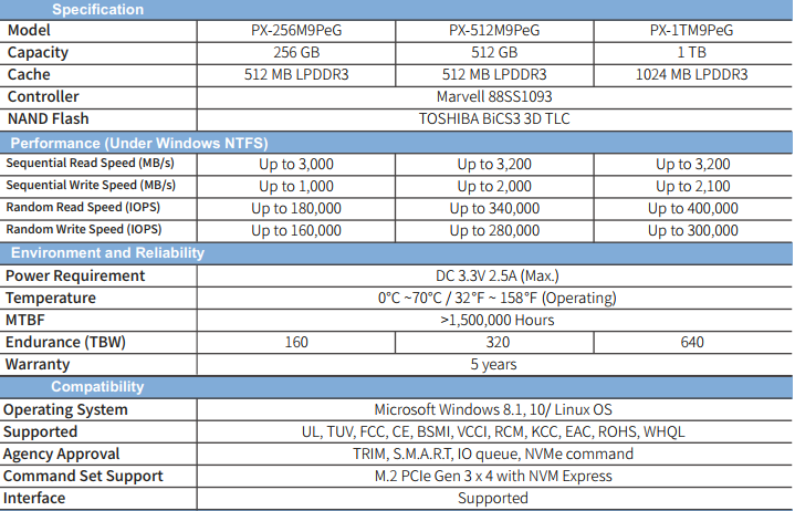 در ساخت این SSD ها از تراشههای حافظه 3D TLC ساخت توشیبا و کنترلر Marvell 88SS1093 در کنار 512 یا یک گیگابایت حافظه کش DRAM استفاده شده است. سرعت خواندن و نوشتن متوالی در مدل 256 گیگابایتی به ترتیب به 3,000 و 1,000 مگابایت در ثانیه، در مدل 256 گیگابایتی به 3,200 و 2,000 مگابایت در ثانیه و در مدل 1 ترابایتی به 3,200 و 1,100 مگابایت در ثانیه میرسد. عملکرد خواندن و نوشتن تصادفی 4K در مدل 256 گیگابایتی به ترتیب به 180,000IOPS و 160,000IOPS، در مدل 512 گیگابایتی به 340,000IOPS و 280,000IOPS و در مدل 1 ترابایتی به 400,000IOPS و 300,000IOPS میرسد. دوام مدل 256 گیگابایتی 160 ترابایت نوشتن در طول عمر، دوام مدل 512 گیگابایتی 320 ترابایت و دوام مدل 1 ترابایتی 640 ترابایت اعلام شده است. این SSD ها تحت وارانتی 5 ساله روانه بازار میشود.