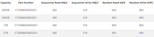 این SSD ها در فرم فاکتور 2.5 اینچی با ضخامت 7 میلی ساخته شدهاند و از رابط SATA با پهنای باند 6 گیگابیت بر ثانیه بهره میبرند. میکرون در ساخت MX500 از کنترلر Silicon Motion SM2258 در ترکیب با تراشههای حافظه 64 لایه TLC خود بهره گرفته است که آن را به یک رقیب جدی برای سری 850 EVO سامسونگ مبدل میسازد. این سری در ظرفیتهای 250 گیگابایت، 500 گیگابایت، 1 ترابایت و 2 ترابایت عرضه میشود.
