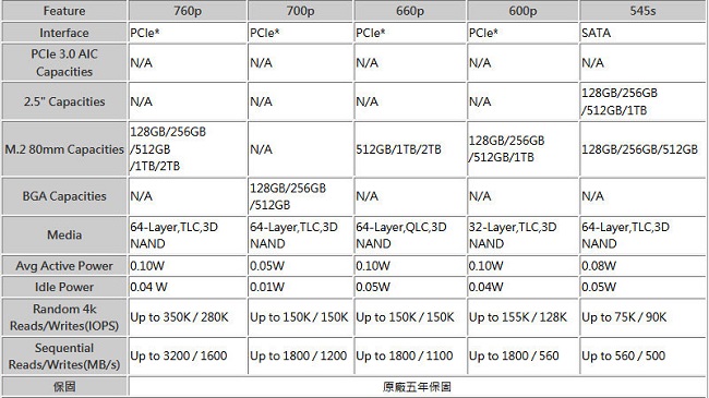 SSD 760p با استفاده از تراشههای حافظه 64 لایه TLC NAND اینتل تولید میشود. کارایی خواندن و نوشتن متوالی این سری به ترتیب به 3,200 و 1,600 مگابایت میرسد. کارایی خواندن و نوشتن تصادفی نیز به 350,000 و 280,000IOPS میرسد. اینتل سری SSD 760p را در ظرفیتهای 128 گیگابایت، 256 گیگابایت، 512 گیگابایت، 1 ترابایت و 2 ترابایت عرضه میکند. ظاهراً به ترتیب با قیمتهای 96 دلار، 240 دلار، 448 دلار و 893 دلار عرضه میشوند.
