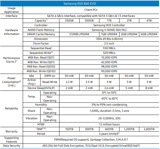 سری 860 EVO از تراشههای حافظه مقرون به صرفهتر TLC NAND ساخت خود سامسونگ در کنار تا چهار گیگابایت حافظه DRAM نوع LPDDR4 بهره میگیرد. حداکثر سرعت خواندن و نوشتن متوالی این سری به ترتیب به 550 و 520 مگابایت بر ثانیه میرسد. عملکرد خواندن و نوشتن تصادفی نیز به 980K IOPS میرسد. سامسونگ 860 EVO را در ظرفیتهای 250 گیگابایت، 500 گیگابایت، 1 ترابایت، 2 ترابایت و 4 ترابایت، در سه فرم فاکتور 2.5 اینچی، mSATA (تا 2 ترابایت) و M.2 (1 ترابایت) عرضه میکند. دوام این سری تا 2,400 ترابایت نوشتن اعلام شده است.