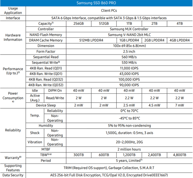 هر دو سری از کنترلر جدید MJX و آخرین نسل از تراشههای حافظه NAND چند لایه سامسونگ (موسوم به V-NAND) بهره میبرند اما تفاوتهای اساسی نیز دارند. سری 860 PRO رده بالاتر، سریعتر، گرانتر و البته بادوامتر از سری 860 EVO است. در ساخت 860 PRO از تراشههای حافظه 64 لایه MLC NAND در کنار تا چهار گیگابایت حافظه DRAM نوع LPDDR4 است. حداکثر سرعت خواندن و نوشتن متوالی این سری به ترتیب به 560 و 530 مگابایت بر ثانیه میرسد. عملکرد خواندن و نوشتن تصادفی نیز به 100K IOPS و 90K IOPS میرسد.