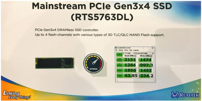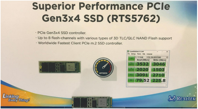 امروزه دیگر سرعتهای بالا به استانداردی برای تولید SSD-ها تبدیل شدهاند و کنترلرهای جدید Realtek هم میتوانند به حداکثر سرعت بسیار بالای 3.5GB/s دست پیدا کنند که البته باید آنها را با اجزای مناسب دیگری هم ترکیب کنید تا این کنترلرهای به توانند به چنین عملکردی دست پیدا کنند. کنترلر جدید RTS5762 از پروتکل NVMe 1.3 پشتیبانی میکند و به همین خاطر میتواند تا ۸ کانال حافظه را مدیریت کنند که البته در کنار آن از نمونههای TLC که با نمونههای QLC NAND در راه هستند هم پشتیبانی میکنند. این کنترلر بر پایه رابط PCIe 3.0 x4 با ۴ خط ارتباطی تولید شده است. Realtek ادعا کرده که کنترلر آنها میتواند به حداکثر سرعتهای ۳۵۰۰ و ۳۰۰۰ مگابایت در ثانیه در فرآیندهای خواندن و نوشتن دست پیدا کند که میتوانید در این زمینه به تصاویر منتشر شده در زیر مراجعه کنید.