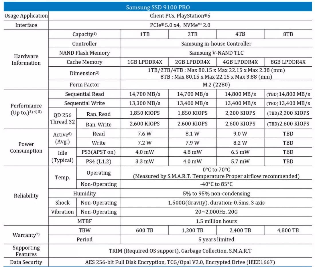 سامسونگ این SSD را در نسخهای مجهز به هیتسینک هم عرضه میکند تا عملکرد پایدارتر باشد و کاهش کارایی ناشی از داغ شدن کنترلر به حداقل برسد. نکته جالب اینکه سامسونگ میگوید طراحی هیتسینک به گونهای انجام شده که با پلیاستیشن ۵ نیز سازگار است و گیمرها میتوانند حدود ۸۰ بازی را روی این حافظه ذخیره کنند.