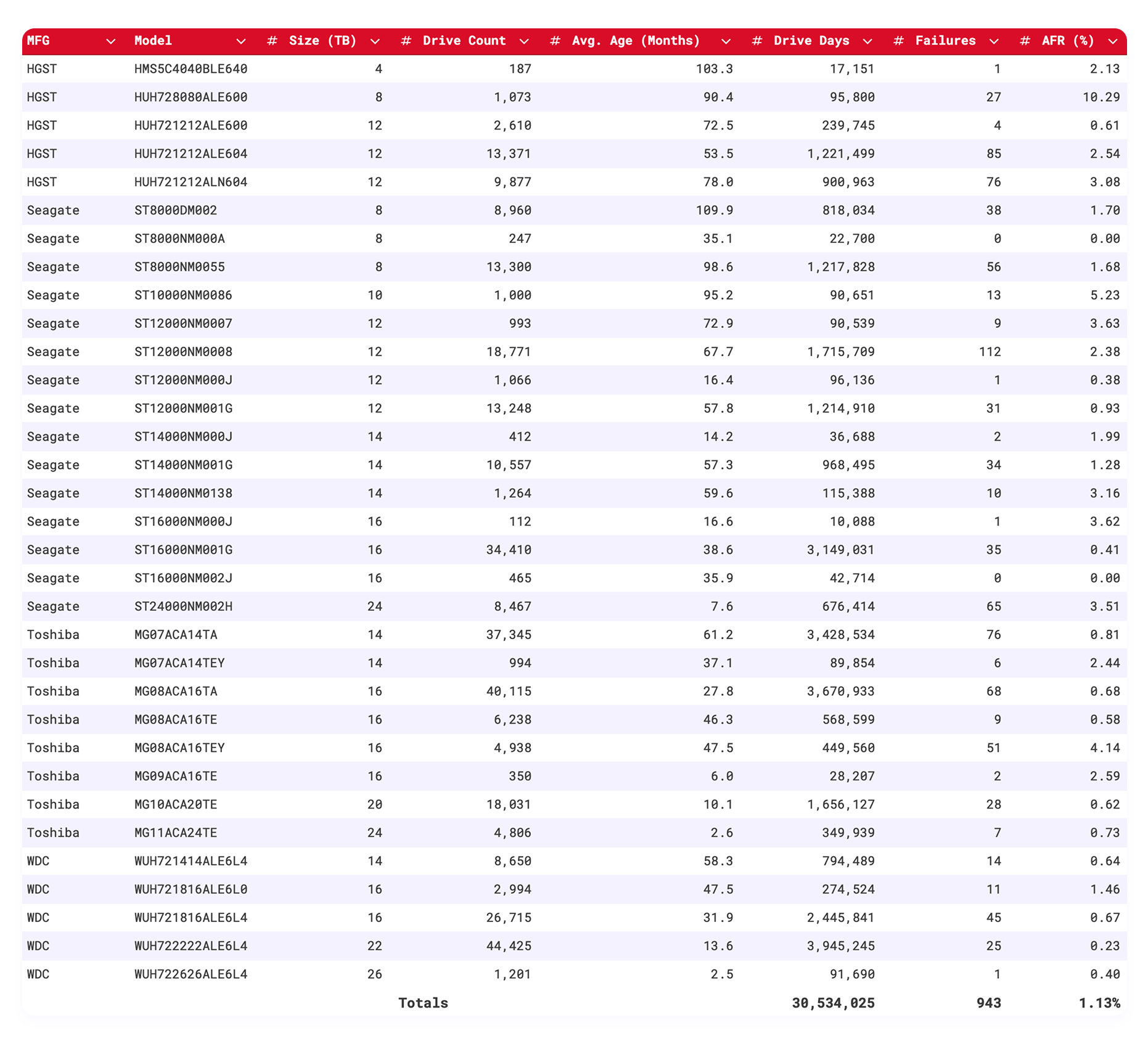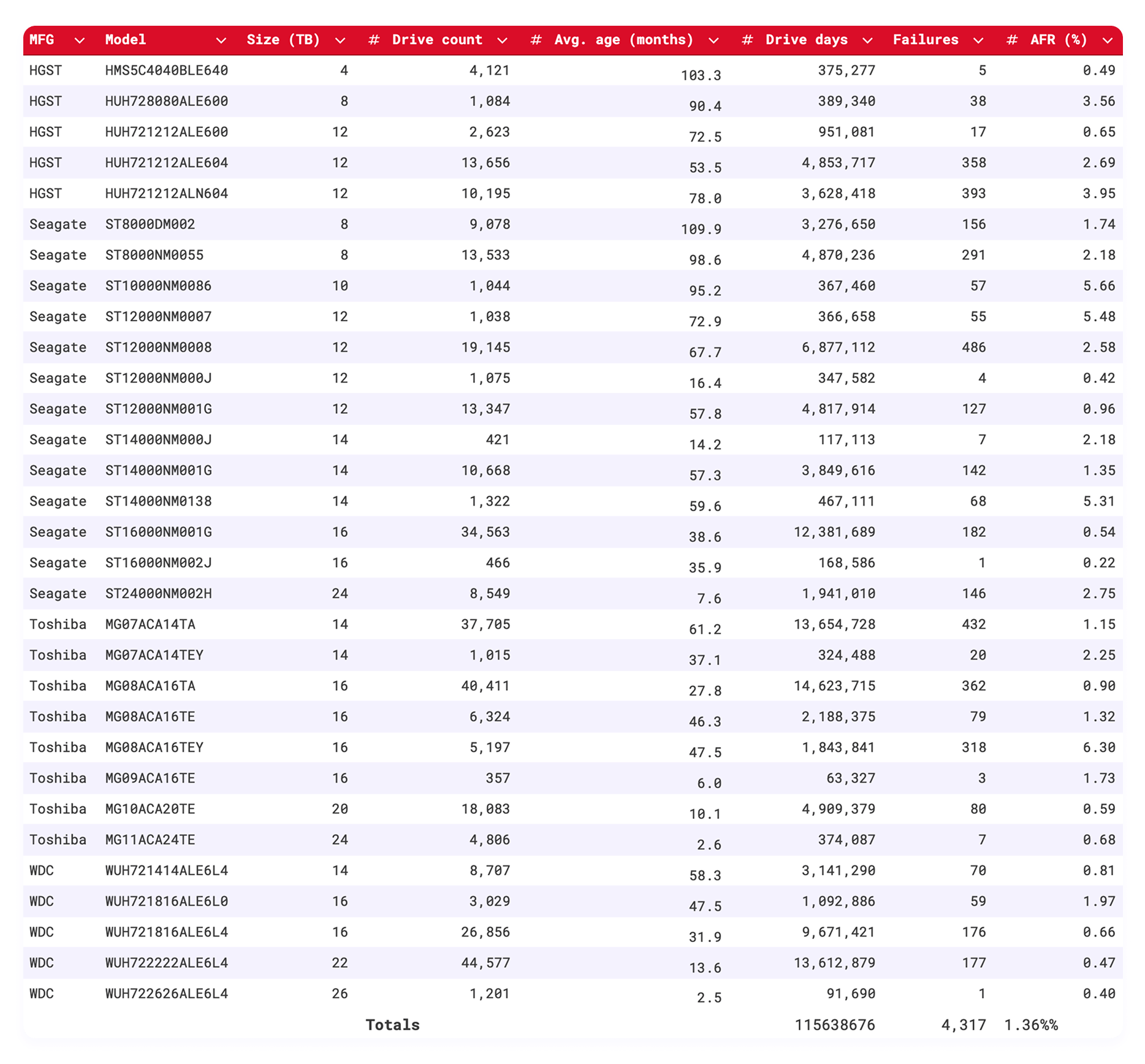 برخی مدلها عملکردی بسیار بهتر از میانگین داشتهاند. هارددیسک Seagate ST16000NM002J با ظرفیت ۱۶ ترابایت تنها یک خرابی در طول سال ثبت کرده است. مدل Western Digital WUH722626ALE6L4 با ظرفیت ۲۶ ترابایت نیز فقط یک خرابی داشته، هرچند فقط یک فصل مورد استفاده قرار گرفته است. پس از آن، Toshiba MG09ACA16TE با ظرفیت ۱۶ ترابایت با سه خرابی قرار دارد، در حالی که Seagate ST12000NM000J با ظرفیت ۱۲ ترابایت و HGST HMS5C4040BLE640 با ظرفیت ۴ ترابایت به ترتیب چهار و پنج خرابی ثبت کردهاند.