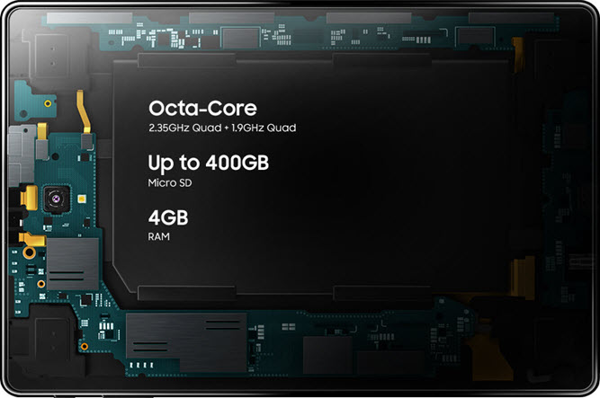 قلب تپنده این تبلت اسنپدراگون 835 است که دارای 30 درصد قدرت گرافیکی بیشتر و 20 درصد قدرت پردازنده بهتر نسبت به Tab S3 است. این پردازنده دارای چهار هسته قوی 2.35 گیگاهرتزی و چهار هسته ضعیفتر 1.9 گیگاهرتزی است. مودم LTE این تبلت آپشنال است و یک مودم Cat 16 با 4 انتن 4x4 MIMO است. این تبلت همچنین به 4 گیگابایت رم و 64 یا 256 گیگابایت حافظه مجهز شده است. درگاه شارژ این تبلت یک USB Type C است که بر بستر ارتباطی USB 3.1 برای سریعترین تبادل اطلاعات اتکا کرده است و از شارژ سریع نیز پشتیبانی میکند. قطر این دستگاه تنها 7.1 میلیمتر است و وزن آن 483 گرم. دوربین جلو این دستگاه یک دوربین 8 مگاپیکسلی برای سلفی و دوربین پشتی یک دوربین 13 مگاپیکسلی با قابلیت ضبط فیلمهای 4K@60fps است. سنسورهای این تبلت شامل مجاورت، شتاب سنج، ژیروسکوپ، قطب نما و اسکنر عنبیه هستند.