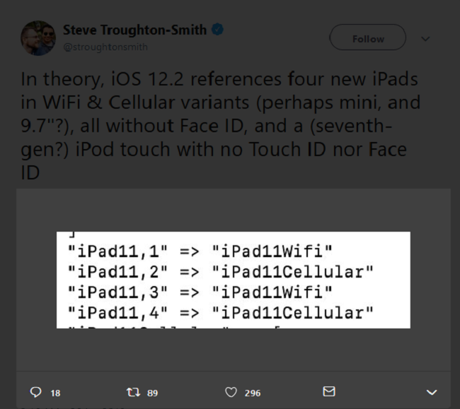 به تازگی برخی از متخصصین با بررسی کدهای مربوط به نسخه آزمایشی iOS 12.2 متوجه وجود کدهایی مربوط به نسخههای جدید آیپد شدهاند که این موضوع تا حد زیادی وجود حداقل دو آیپد جدید را تایید میکند. استیو اسمیت در توییتر شخصی مدعی شده است که در نسخهی بتای سیستم عامل iOS 12.2 کدهای مربوط به دو آیپد جدید و آیپاد تاچ را پیدا کرده است. در کدهای منتشر شده توسط استیو اسمیت در توییتر، شاهد 4 کد مربوط به آیپد هستیم که مربوط به نسخه Wifi و نسخه سیم کارت خور این تبلت برای پشتیبانی از شبکه سلولار میشود. به احتمال بسیار زیاد این دو تبلت جایگزینهای ایپد مینی 5 و آیپد 9.7 اینچی خواهند بود.