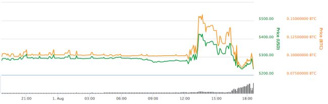 همانطور که در تصویر مشاهده میکنید با ورود بیت کوین کش به بازار شاهد ایجاد نقطه اوجی در قیمت این ارز دیجیتالی بودیم و در ادامه کاهش قیمت چشمگیر آن به ثبت رسیده است. در نگاه کلیتر میتوان ارزش ۲۰۰ تا ۳۰۰ دلار را برای بیتکوین کش درنظر گرفت. نکته قابل توجه دیگر آنکه ارزش Bitcoin Cash رابطه مستقیمی با ارزش بیتکوین دارد. تا اینجای کار، شرایط بازار حکایت از آن دارد که ارز جدید، ارزش ۷ تا ۱۰ درصدی در مقایسه با نمونه قدیمی دارد.