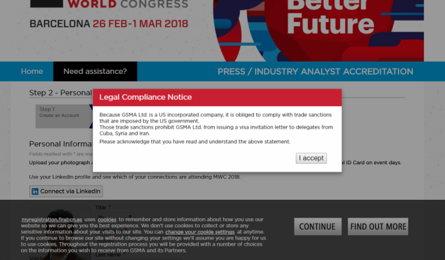 انجمن جهانی موبایل (GSMA) به عنوان اصلیترین مرجع بینالمللی در تعیین ساختار شناسه جهانی تجهیزات موبایل یا همان IMEI که در اواخر شهریورماه از توقف ارائه خدمات به کشورمان خبر داده بود حالا اعلام کرده از ثبتنام شهروندان ایرانی برای حضور در کنگره جهانی موبایل بارسلونا نیز ممانعت خواهد کرد. پیش از این مقامات کشورمان از رایزنی با مسئولان بلندپایه این انجمن در جهت رفع محدودیتها خبر داده بودند. در همان زمان برخی کارشناسان وعده داده بوند توقف ارائه خدمات GSMA به طرف ایرانی، بر حضور شرکتها و اپراتورهای کشورمان در نمایشگاه بینالمللی بارسلونا تاثیرگذار شود. نمایشگاه بینالمللی بارسلونا یکی از بزرگترین رویدادهای صنعت موبایل در جهان به حساب میآید. وزیر ارتباطات پیش از این در حساب توییتری خود از تمدید مجوز حضور شرکتهای ایرانی در GSMA خبر داده بود. آذری جهرمی، خبر تحریم ایران توسط GSMA را غیردقیق خوانده بود.