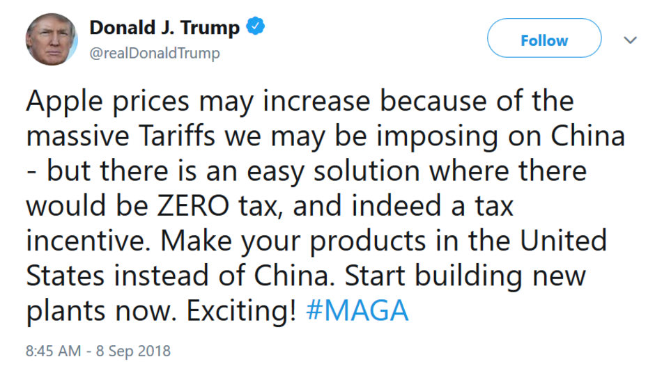اپل با داشتن کارخانه در چین، تعداد زیادی از محصولات خود را که شامل Apple Watch، هوم پاد اپل، ایرپادهای اپل و مداد اپل میشوند را از یک کشور خارجی وارد آمریکا میکند. اپل به عنوان اولین کمپانی یک تریلیون دلاری آمریکا میتواند به راحتی تأثیر زیادی بر اقتصاد این کشور بگذارد. به همین علت رئیس جمهور از اپل درخواست کرده است که کارخانهها و شغلهای خود را از چین به آمریکا منتقل کند. به گفته ترامپ با این کار نه تنها مالیاتهای مربوط به واردات از بین میروند بلکه اپل مشوقهای مالیاتی نیز دریافت میکند.