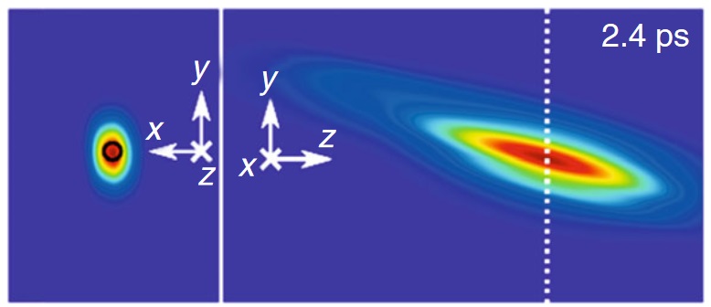 با استفاده از این روش میتوان هر نوع عکسی را در سرعت های مورد نظر ثبت کرد که تا واحدهای 100 فمتو ثانیه نیز قابل تقسیم خواهد بود. یعنی در طول هر ثانیه میتوانیم تا 10 تریلیون تصویر را ثبت کنیم. همانطور که میبینید میزان دیتایی که در این روش تولید میشود بسیار زیاد خواهد بود و هنوز ما به حافظه هایی دسترسی نداریم که بتوانند این حجم از اطلاعات را برای یک ثانیه ثبت کنند و به همین خاطر دستگاه طراحی شده توسط محققین Caltech تنها قادر به فیلمبرداری به مدت 25 پیکو ثانیه خواهد بود. در ادامه تصویر حرکت یک پالس نوری از یک شکاف دهنده پرتویی را مشاهده میکنید که مقداری از فوتون ها در آن بازتاب شده و مقداری دیگر نیز از آن عبور میکنند.
