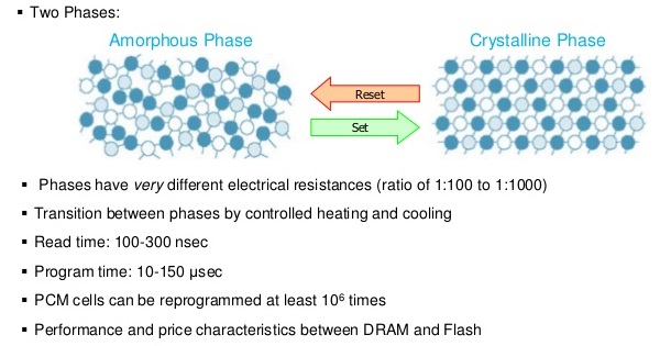 Chalcogenide Glass ها از جمله موادی هستند که به آسانی می توانند از حالت شیشه به بلور و بالعکس تغییر شکل بدهند. این تغییر حالت سبب می شود تا خواص نوری و الکتریکی آنها نیز تغییر پیدا کند. سطحی ترین لایه از CD ها و DVD های دارای قابلیت رایت دوباره از این مواد تشکیل شده اند و در هنگام ذخیره سازی اطلاعات بر روی این دیسک ها ماده Chalcogenide Glass با استفاده از یک لیزر قدرتمند بین دو حالت شیشه و کریستال تغییر حالت می دهد. در هنگام خواندن اطلاعات که از لیزرهای با توان کمتر استفاده می شود نیز این ماده حالت شیشه ای و بدون نظم خود را حفظ می کند. این مواد همچنین در حافظه هایی که بر اساس تغییر فاز مواد کار می کنند (شکل بالا) هم به کار برده می شوند.
