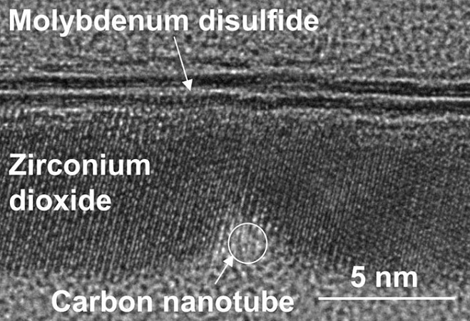 در حال حاضر با استفاده از روش های لیتوگرافی معمول، نمیتوان ساختارهای به ابعاد ریزی مانند 1 نانومتر تولید کرد. به همین خاطر محققان از کربن که میتواند منظم ترین ساختار های اتمی را به وجود آورد استفاده کرده اند تا بتوانند تیوب های با سیلندرهای توخالی ایجاد کنند که ابعاد آنها به 1 نانومتر برسد (دقیقاً به همین خاطر است که به این ساختار نانوتیوب های کربنی میگویند). پس با توجه به این توضیحات حالا میتوانیم ترانزیستور مورد نظر خود را شکل دهیم، ترانزیستور اثر میدانی (Filed Effect Transistor) که گیت آن با نانو لوله های کربنی یا همان گرافن ساخته شده و برای کانال های نیمه هادی از دی سولفید مولیبدنیوم در آن استفاده شده است و در عین حال ابعاد گیت ترانزیستور ما 1 نانومتر است و میتوانیم بستر پایه ترانزیستور را با استفاده از MoS2 به راحتی طراحی کرده و بسازیم. البته در این حالت از دیاکسید زیرکونیوم یا همان ZrO2 نیز به عنوان دیگر رسانای یونی در این ساختار استفاده خواهد شد.