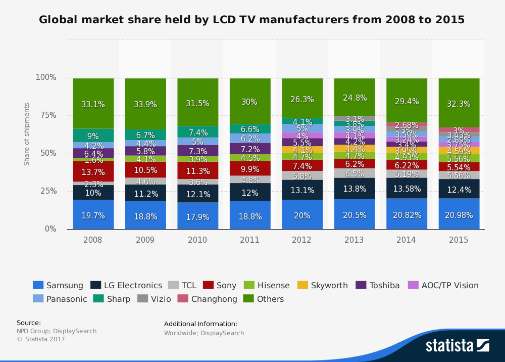 اما این که بدانیم کدام شرکت ها در حال حاضر یکه تاز این بازار هستند هم میتواند بسیار جالب باشد. وبسایت تحلیلی WitsView به تازگی آماری را از میزان فروش برند های مختلف تلویزیون در سراسر دنیا منتشر کرده است که نشان میدهد بازار کل تلویزیون های LCD در سراسر دنیا توانسته با 1.6 درصد افزایش در تعداد، به 219.2 میلیون دستگاه برسد. به مانند سالیان گذشته، غول کره ای، سامسونگ یکه تاز بازار بوده است و توانسته با 47.9 میلیون دستگاه به رتبه اول در بین شرکت های تولید کننده تلویزیون برسد. به عقیده بسیاری از منتقدین، استفاده از تکنولوژی های جدیدی که مرتّباً بروز میشوند در کنار قیمت مناسب و البته شبکه تبلیغاتی و توزیع بسیار گسترده در سراسر دنیا، به سامسونگ کمک کرده تا بتواند به مانند همه آمار منتشر شده طی 9 سال گذشته، یکه تاز این بازار باشد.