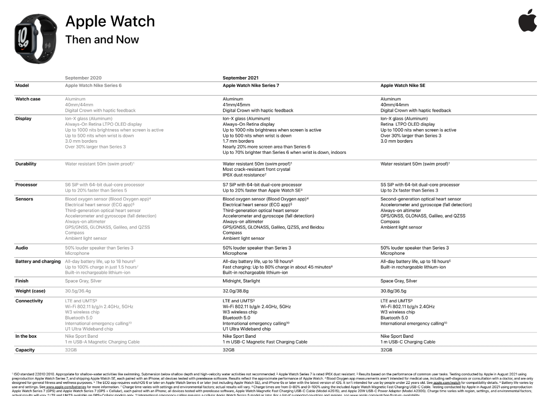 در این لیک به وضوح از مشخصات جدیدترین ساعت هوشمند اپل به همراه ساعتهای قدیمی سری 6، سری 3 و SE نام برده شده است. وزن، برجستهترین مشخصه مدلهای سری 7 است. نسخه با قطر 41 میلیمتری با بدنه آلومینیومی فقط 32 گرم وزن دارد.