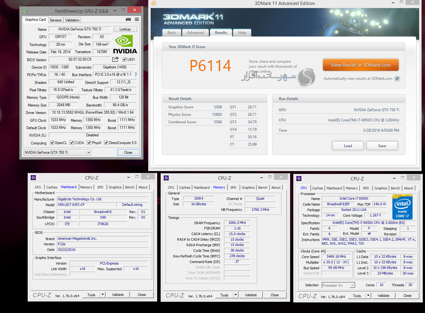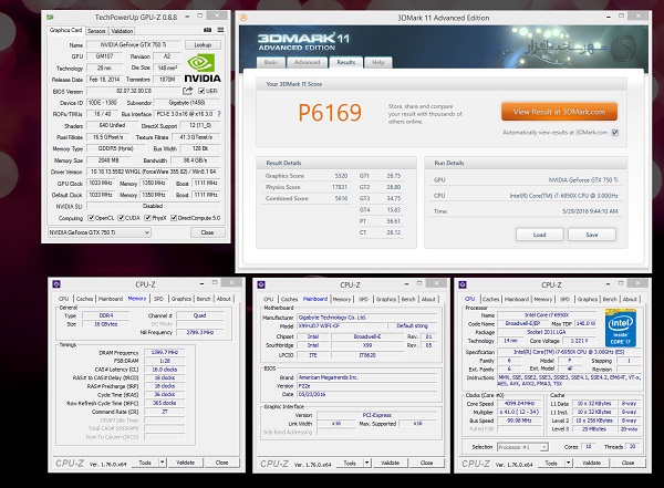 با اورکلاک پردازنده به 4.1 گیگاهرتز و تنظیم فرکانس حافظه بر روی 2800 مگاهرتز، به دلیل گرافیک محور بودن این آزمون، امتیاز کلی 3DMark11 بدون تغییر قابل توجهی به P6169 رسید اما در همین حال امتیاز physics به 17831 افزایش پیدا کرد که یکبار دیگر پتانسیل بسیار عالی Core i7-6950X و مادربرد GA-X99-UD7 WIFI گیگابایت را به ما نشان می دهد.