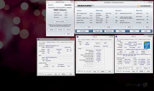 و اما حالا به بررسی های گیمر محور، یعنی مجموعه بنچمارک های 3DMark می رسیم. برای شروع 3DMark6 خوب به نظر می رسد فقط فراموش نکنید در این بررسی ما از کارت گرافیک نسبتاً بی بخار GTX 750 Ti استفاده کردیم تا بنچمارک ها بیشتر بازتاب دهنده عملکرد پردازنده باشند. یکبار دیگر با فرکانس پیش فرض و فرکانس حافظه 2133 مگاهرتز این تست را شروع کردیم. در حالی که امتیاز کلی 29895 Marks به دلیل نبود کارت گرافیک گیمینگ زیاد جالب نیست، اما این امتیاز 10753 پردازنده در این آزمون نسبت به Haswell-E خیلی بهتر است.