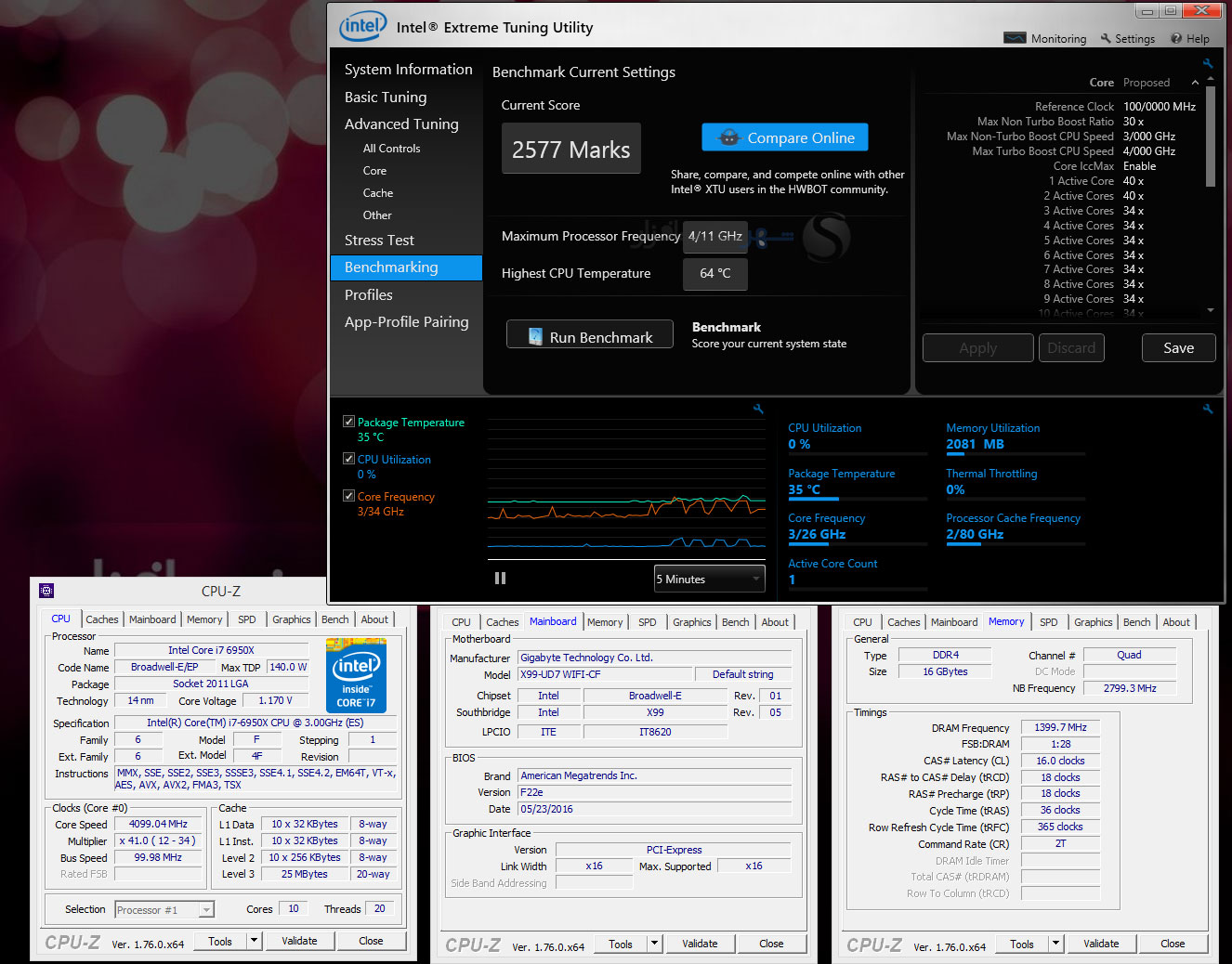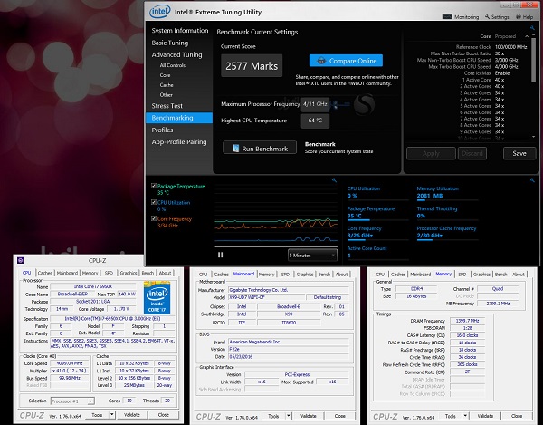 با اورکلاک کردن پردازنده تا فرکانس 4.11 گیگاهرتز و فرکانس حافظه 2800 مگاهرتز، امتیاز XTU به طرز خارق العاده ای به 2577 Marks رسید. بهتر است دیگر به Core i7 6700K اشاره نکنیم تا این پردازنده انقدر مایوس نشود، بالاخره باید پذیرفت برخی توانایی ها ذاتی است و با تلاش هیچگاه نمی توان به آن دست پیدا کرد.