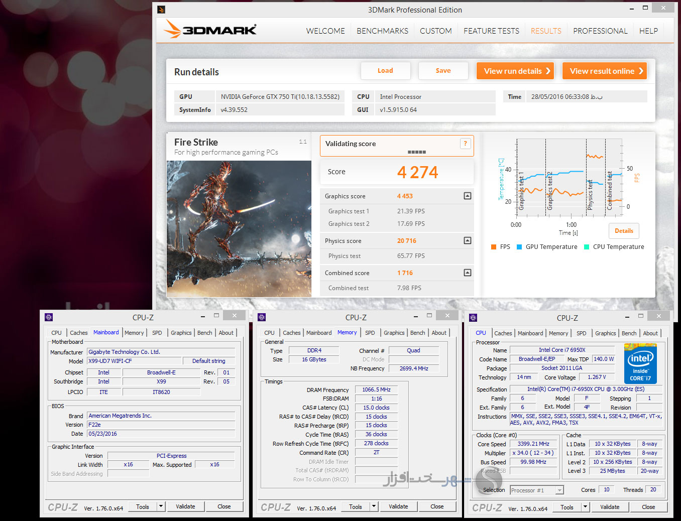 در نهایت به 3DMARK13 می رسیم، با فرکانس پیش فرض، امتیاز کلی 4274 و physicsا20716 به دست آمد که در بخش پردازنده فوق العاده است.