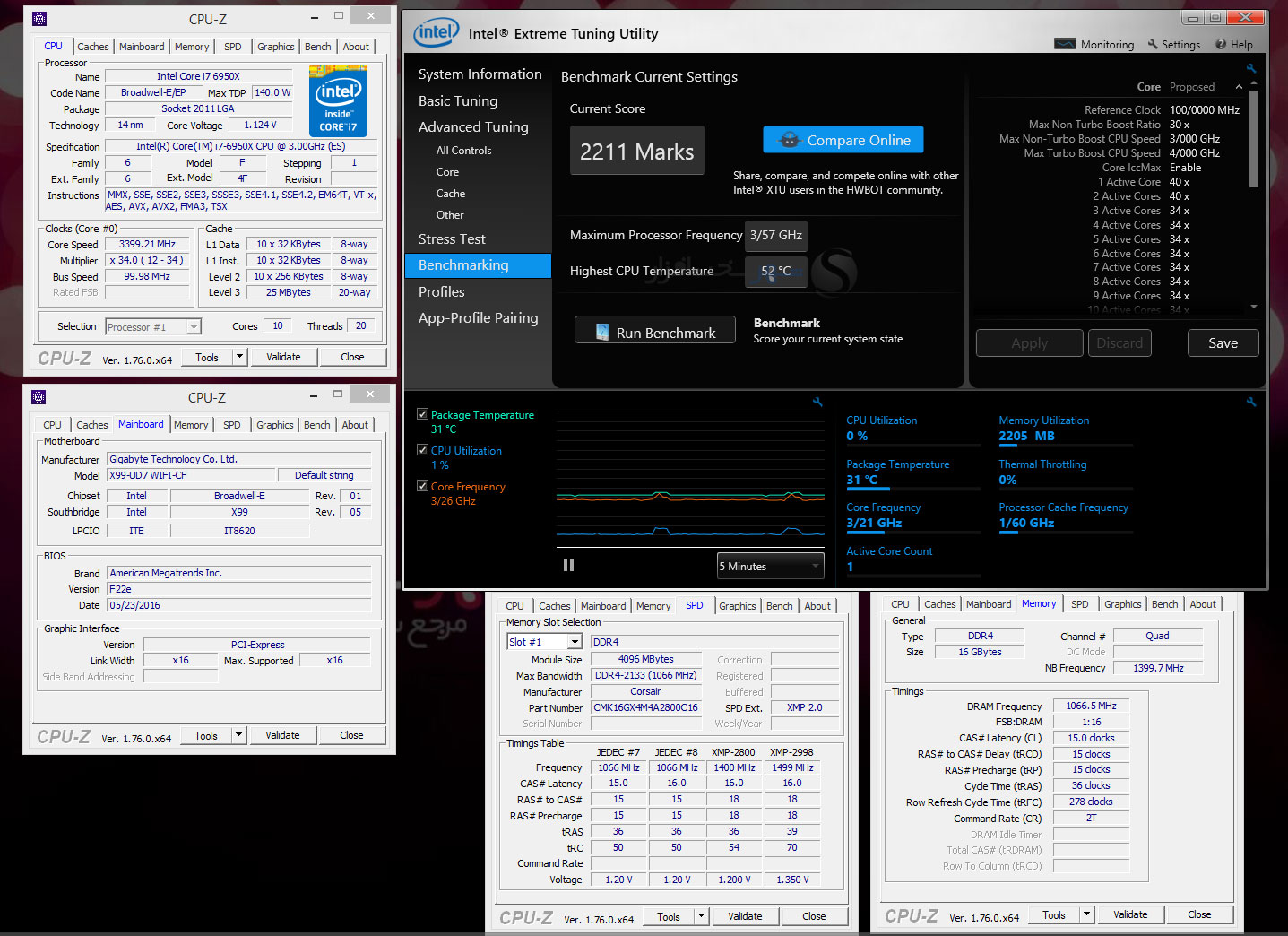 نوبتی هم که باشد به XTU یا Extreme Tuning Utility می رسیم. این بنچمارک کارایی پردازنده در ترکیب با حافظه رم بررسی می کند و آزمون خوبی برای پی بردن به عظمت و شکوه Core i7-6950X است. از بس محو این پردازنده شده ایم که معماری Broadwell-E را به کلی فراموش کردیم، بد نیست یادی هم بکنیم از این شاهکار بزرگ 14 نانومتری! ابر پردازنده 20 هسته ای ما با آن ویژگی های سرسام آورنده اش، امتیاز 2211 Marks را در این آزمون کسب کرد که بسیار فراتر از امتیاز قابل دستیابی با Core i7 6700K است.