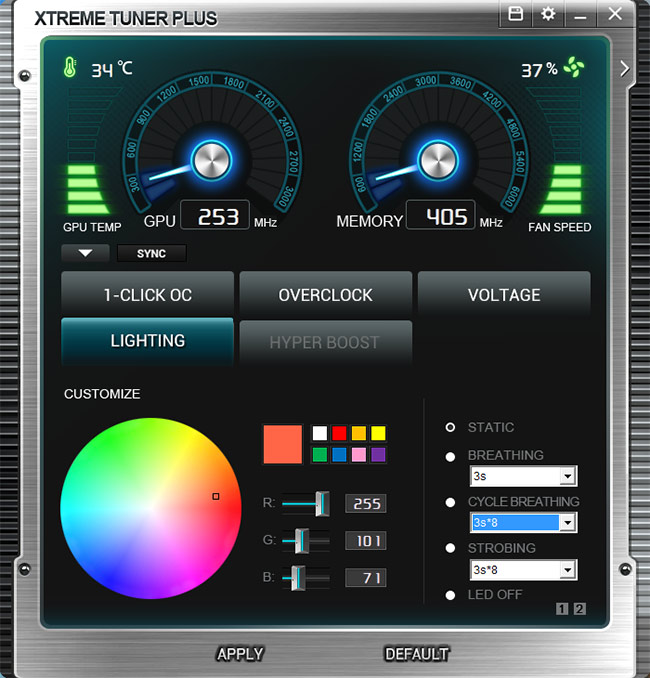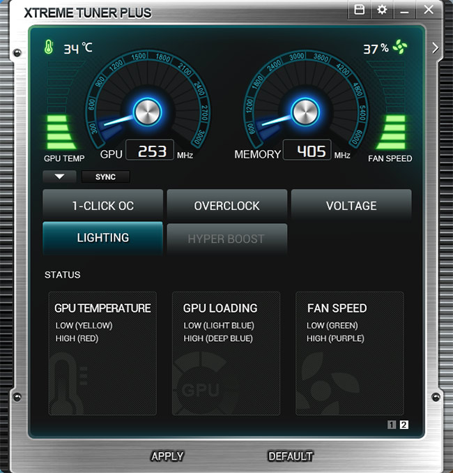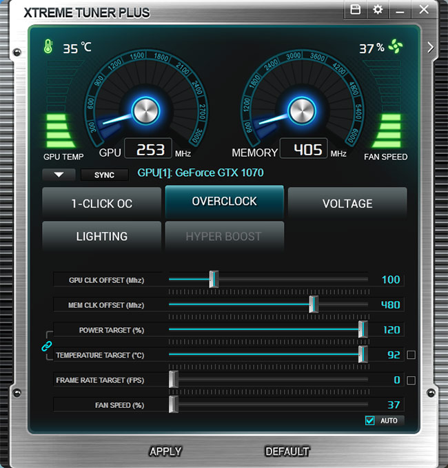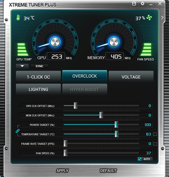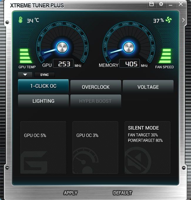 Xtreme Tuner Plus در مقایسه با نرم افزارهای مشابه از کمپانیهای رقیب شاید در ظاهر سادهتر به نظر برسد ولی امکانات کاربردی فراوانی را برای اورکلاکرها فراهم میکند. همانطور که در تصویر بالا ملاحظه میکنید امکانات این نرم افزار بهصورت کلی در 5 تب مجزا گنجانده شده است و البته مهمترین پارامترهای مانیتورینگ کارت گرافیک که شامل فرکانسهای هسته و تراشههای حافظه، سرعت چرخش فن و حرارت هسته GPU میشوند در بخش بالایی این رابط کاربری بهصورت ثابت گنجانده شدهاند. در تب 1CLICK OC همانطور که از اسم آن مشخص است 2 پروفایل از پیش تعیین شده اورکلاک و 1 پروفایل Silent mode برای گیمینگ در سکوت مطلق در نظر گرفته شده است که تنها با کلیک کردن بر روی آنها بلافاصله تنظیمات مورد نظر فراخوانی میشود.