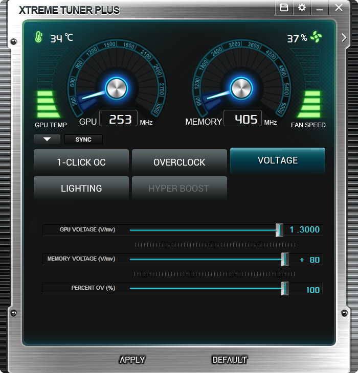 در تب ولتاژ نیز هر 3 پارامتر ولتاژ مهم که در دستیابی اورکلاکرها به فرکانسهای بالاتر مورد نیاز است یعنی ولتاژ هسته GPU، ولتاژ تراشههای حافظه و ولتاژ بخش PLL در دسترس است.