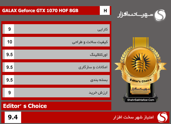 با تمامی این تفاسیر کارت گرافیک "GALAX Geforce GTX 1070 HOF 8GB" موفق به کسب امتیاز ممتاز 9.4، نشان " Editors' Choice" و ریز امتیازات زیر در کلاس محصولات (H (High-End از لابراتوار شهر سختافزار شد.