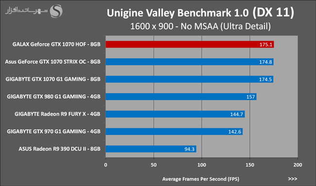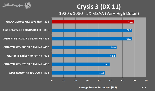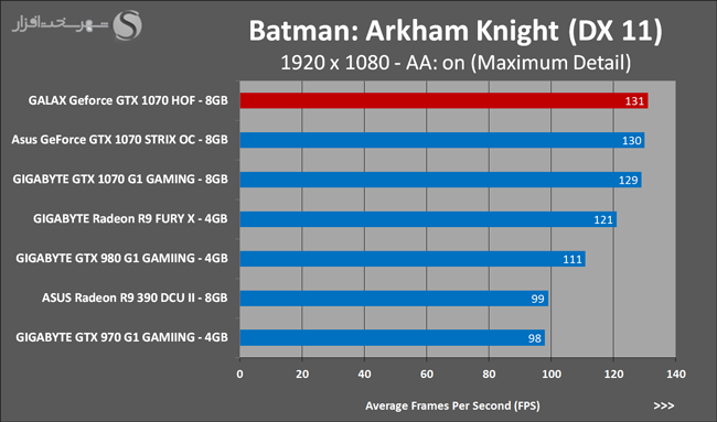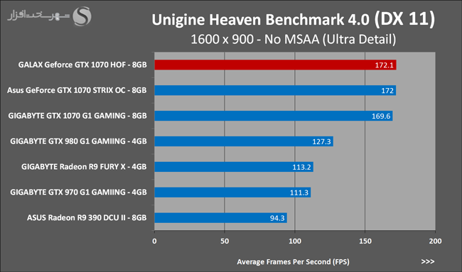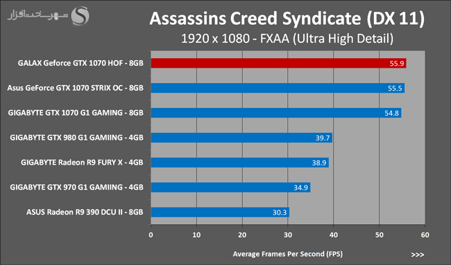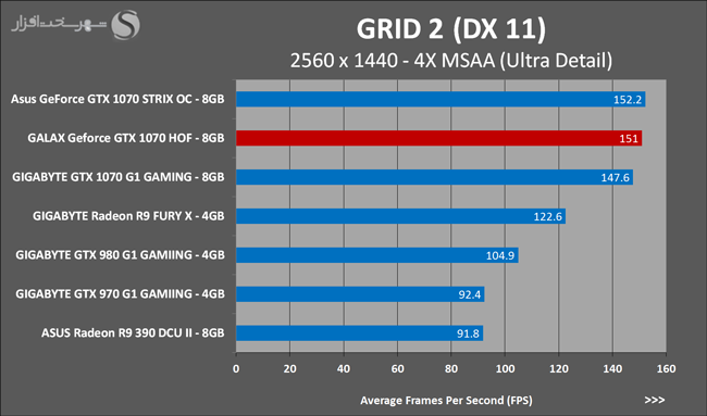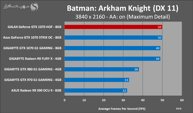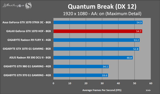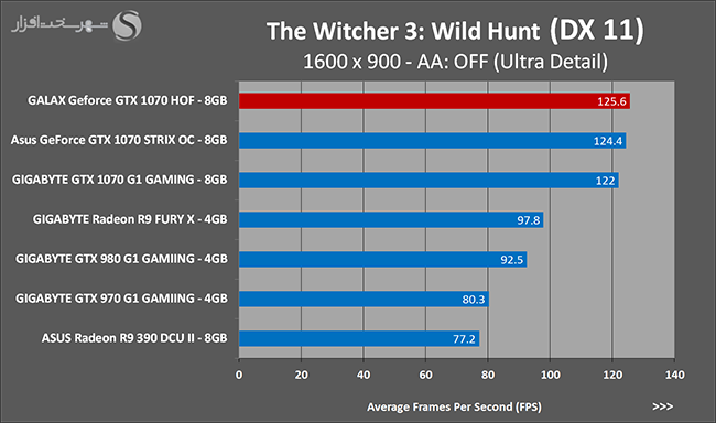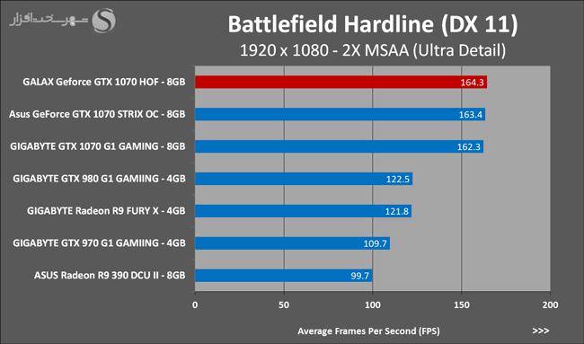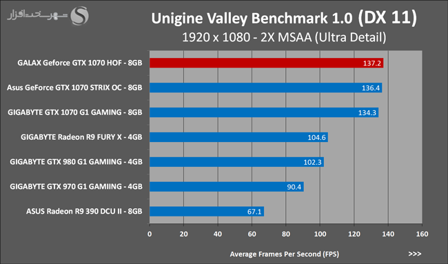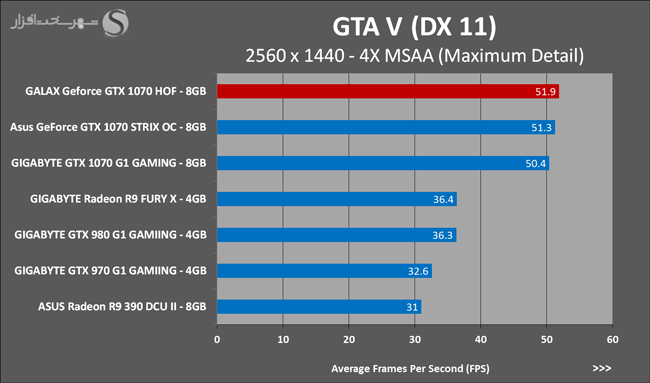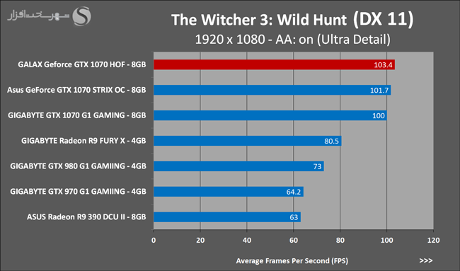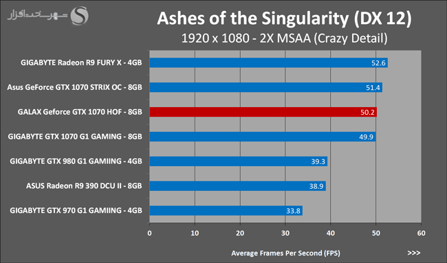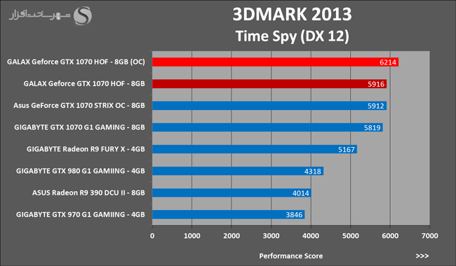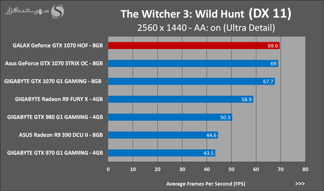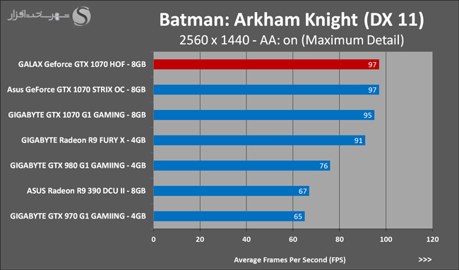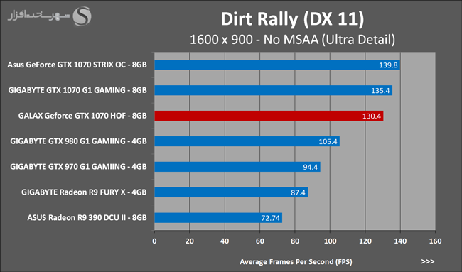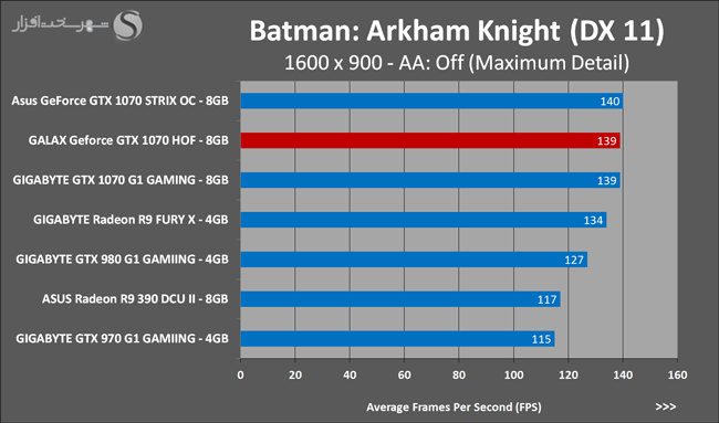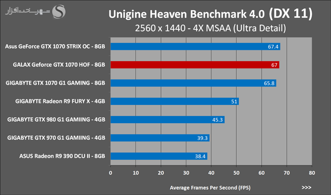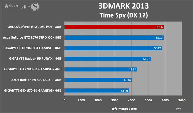 به روشنی مشخص است که کارایی Geforce GTX 1070 نسبت به نمونه مشابه نسل قبل خود (Geforce GTX 970) بیش از 50% افزایش داشته است! اما همانطور که در تست قبل به آن اشاره شد GALAX Geforce GTX 1070 HOF به دلیل تجهیز به کولر قدرتمندتر و محدودیتهای مدیریت مصرف انرژی کمتر در تستهای طولانی مدت که در آنها حرارت و مصرف انرژی GPU به حداکثر مقادیر تعیین شده نزدیک میشود عملکرد بهتری از خود ارائه کرده است!