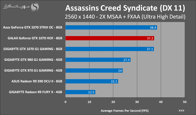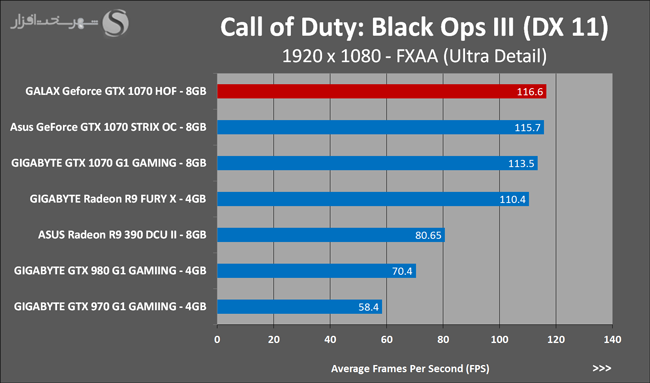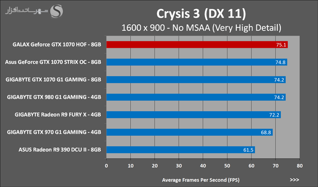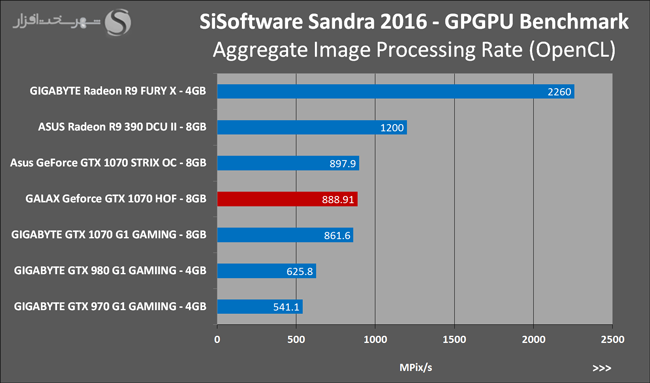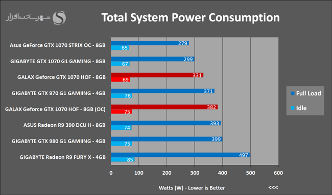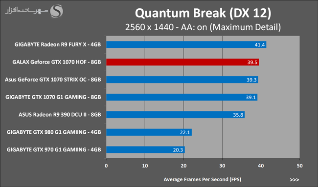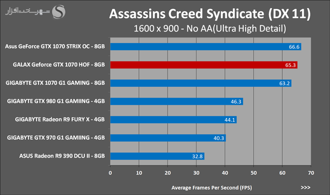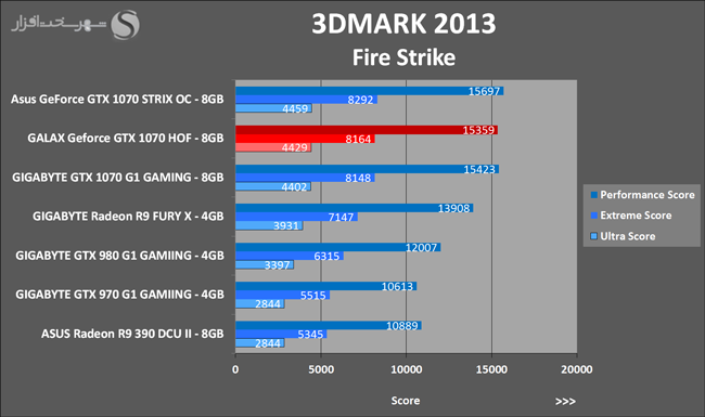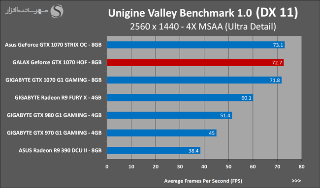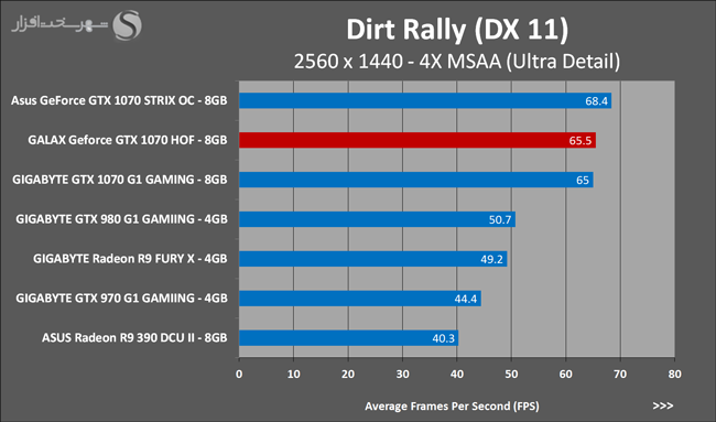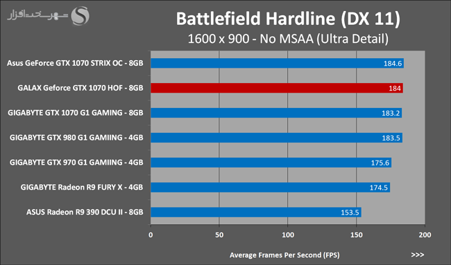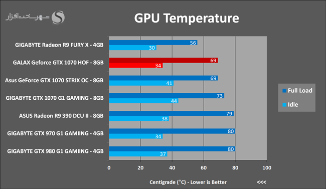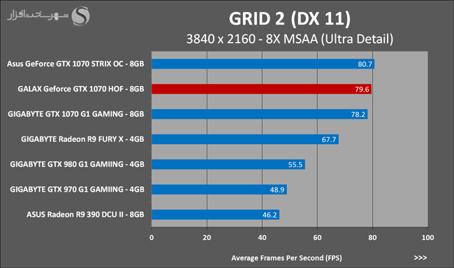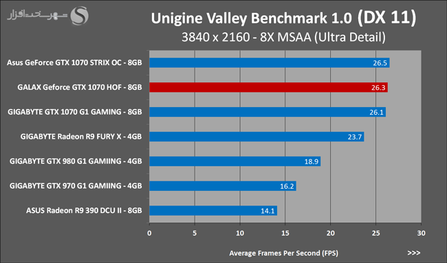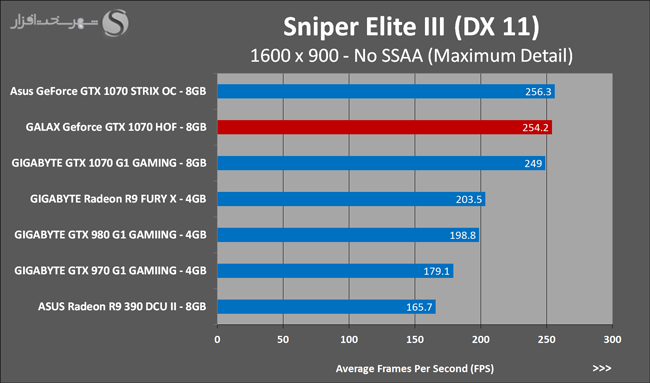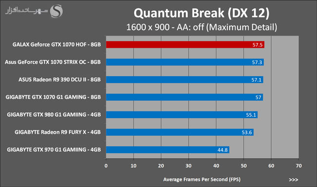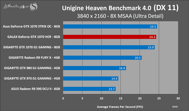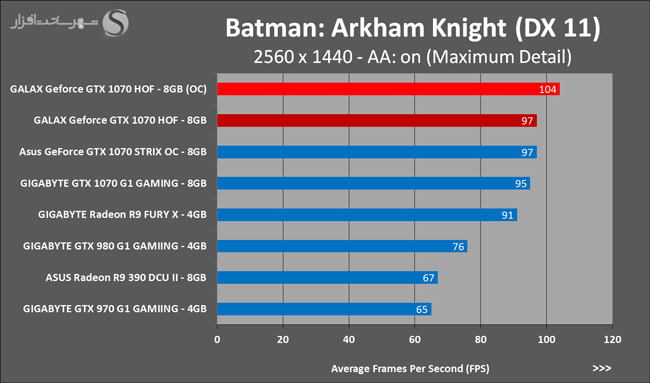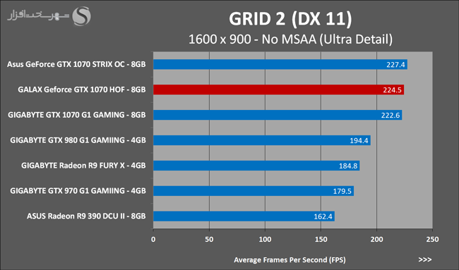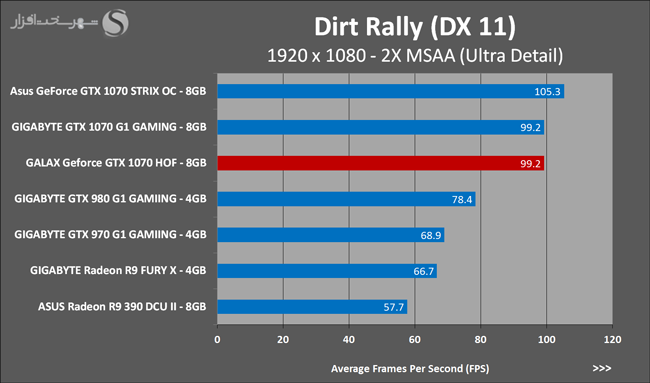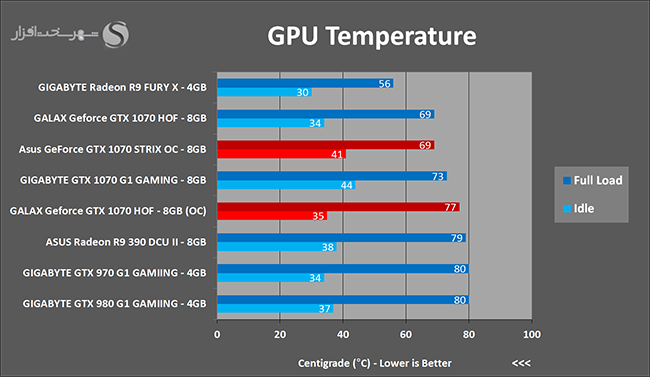 به روشنی مشخص است که کارایی Geforce GTX 1070 نسبت به نمونه مشابه نسل قبل خود (Geforce GTX 970) بیش از 50% افزایش داشته است! اما همانطور که در تست قبل به آن اشاره شد GALAX Geforce GTX 1070 HOF به دلیل تجهیز به کولر قدرتمندتر و محدودیتهای مدیریت مصرف انرژی کمتر در تستهای طولانی مدت که در آنها حرارت و مصرف انرژی GPU به حداکثر مقادیر تعیین شده نزدیک میشود عملکرد بهتری از خود ارائه کرده است!