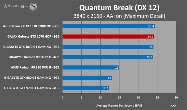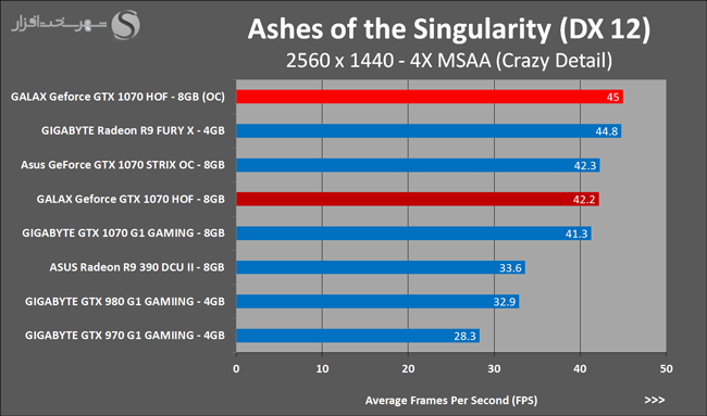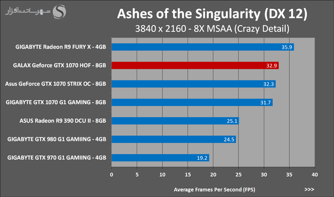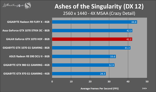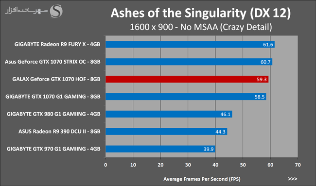 یکی دیگر از نقاط ضعف تراشههای گرافیکی مبتنی بر معماری Pascal همانند Maxwell ضعف آنها در محاسبات بهاصطلاح Async Compute یا ناهمزمان است. محاسباتی که پردازش کارآمد آنها در گیم ها و برنامههای مبتنی بر DirectX 12 نقش مهمی در افزایش بهرهوری کارایی نهایی خواهد داشت. در نمودارهای بالا ملاحظه میکنید که در این گیم به دلیل حجم بالای محاسبات ناهمزمان، Geforce GTX 1070 نتوانسته تمامی تواناییهای خود را ارائه کند و این تراشههای گرافیکی AMD هستند که در اکثر گیم های مبتنی بر DirectX 12 پیروز میدان هستند. در این نمودارها نیز مشاهده میکنید که در رزولوشنهای بالا و سنگینتر شدن تست این GALAX Geforce GTX 1070 HOF است که بهتر از سایر رقبا ظاهر میشود. البته اختلاف میان تمام مدلهای مشابه آنقدر کم است که در عمل میتوان آن را نادیده گرفت.