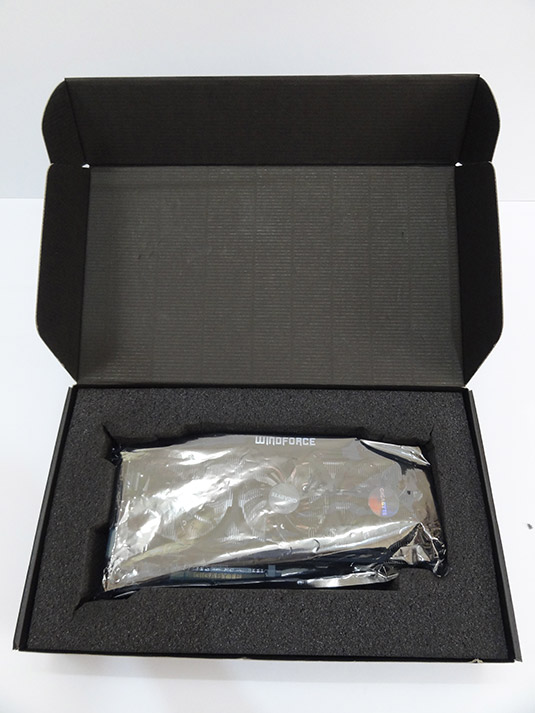 با باز کردن پوشش مقوایی با این جعبه مشکی رنگ روبرو خواهید شد که کارت گرافیک و متعلقاتش را که میان فوم اسفنجی تعبیه شده اند را در خود جای داده است.