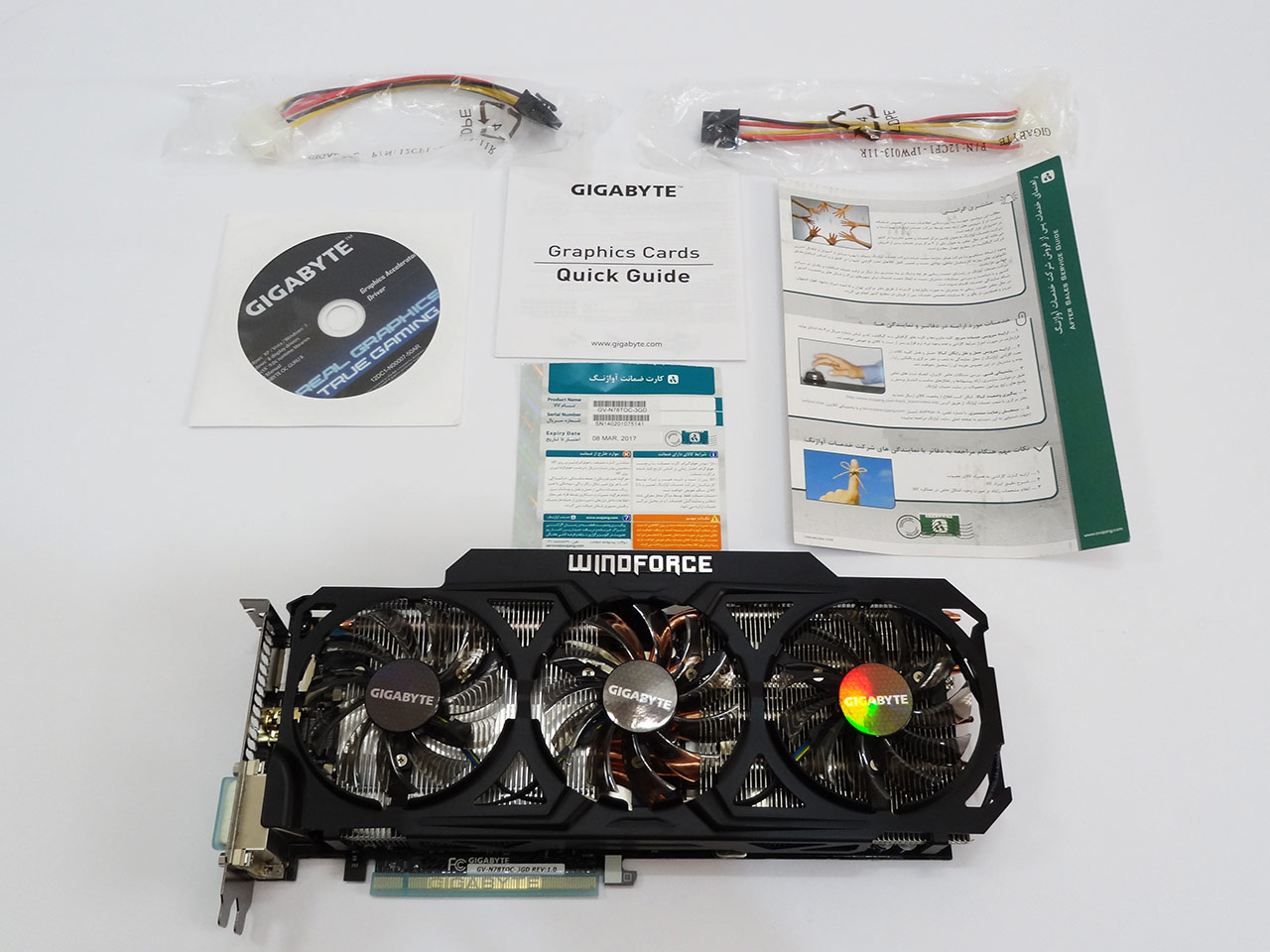 محتویات داخل جعبه را فقط 2 عدد تبدیل کانکتور Molex 4-Pin به دو کانکتور 8Pin PCI-E و راهنمای نصب و CD راه انداز حاوی درایور و نرم افزارهای جانبی تشکیل می دهد و خبری از مبدل های خروجی تصویر و پل SLI نیست !